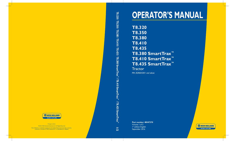 Download New Holland T8.320 , T8.350 , T8.380 , T8.410 , T8.435 , T8.380 SmartTrax , T8.410 SmartTrax , T8.435 SmartTrax Tractor Operator's Manual ( PIN ZGRE05001 and above )