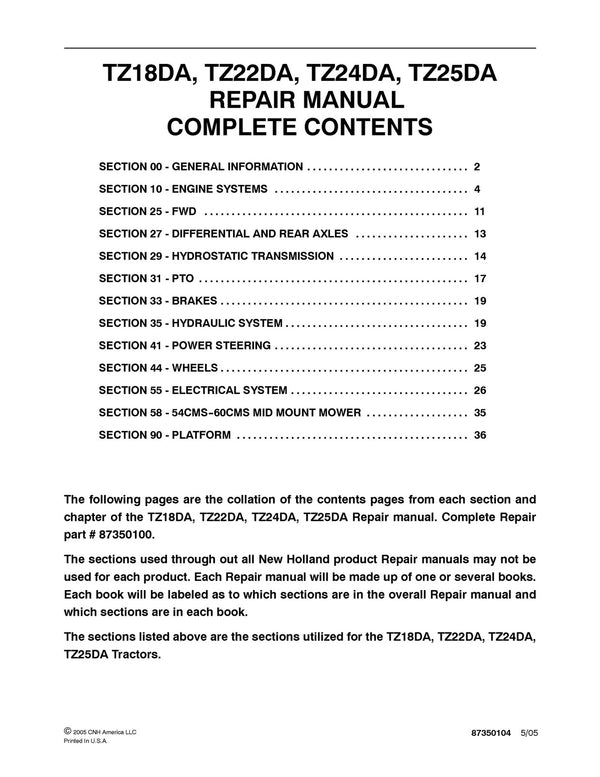 It is Complete Original Factory for New Holland TZ18DA, TZ22DA, TZ24DA, TZ25DA Tractor. Covers all the service and repair information about New Holland TZ18DA, TZ22DA, TZ24DA, TZ25DA Tractor. The information in this manual covers everything you need to know when you want to service and repair New Holland TZ18DA, TZ22DA, TZ24DA, TZ25DA Tractor.